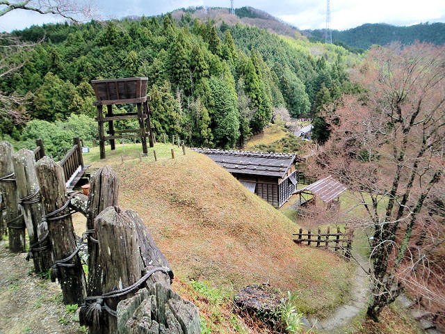 挙母城(ころも城)を後にして約40分で足助城(あすけ城)に着きました。昼時なのか拝観者は3人しかいませんでした。足助城は、愛知県東加茂郡足助町足助字真弓での所在地として長かったのですが2005年の市町村合併で新たに豊田市に加わることになりました。紅葉の観光地としても有名で香嵐渓(こうらんけい)と呼ばれています。足助城は標高301mの真弓山の山頂を本丸としており、四方に張り出した尾根を利用した連郭式の山城です。足助城は別名を真弓山城(まゆみ山城)とも呼びますが、他に「松山城」「足助松山城」とも呼ばれていました。鎌倉時代が背景で足助氏が築いた「足助七屋敷」の一つとも伝えられています。発掘調査での遺構からは15世紀以降に鈴木氏が築城した跡と考えられています。鈴木氏は、忠親、重政、重直、信重、康重と五代わたり続きます。16世紀に入ってから岡崎の松平氏との間で従属離反を繰り返しますが、永禄7年(1564)以降は松平氏のもとで高天神城の戦いなどに武勲をあげています。天正18年(1590)5代目康重の時、徳川家康に従って関東国に入国した為足助城は廃城の道を辿りました。沿革の中でふれていませんが、元亀2年(1571)に甲州の武田信玄2万5千の兵に攻められ一時は武田方の下条伊豆守信氏を城代としました。信玄没後家康の長男の岡崎三郎信康が武田勢を追い払い鈴木氏を復活させました。余談ですがお城の話で詳細や知らない名称そして人物の登場では興味が湧かないのが現実でが、築城者の人脈や名勝負などが出てくると興味が出たりする事もあると思い少しふれてみました。登城はかなり勾配がきつい坂道です。道路の幅3.5mで対向車に十分注意しながら麓から車で約10分、徒歩約30分。見どころは本丸、高櫓、物見矢倉。アクセスは名鉄「浄水駅」より、とよたおいでんバス「一の谷口」から徒歩約40分。猿投(さなげ)グリーンロード「力石」より153号線足助城まで約25分