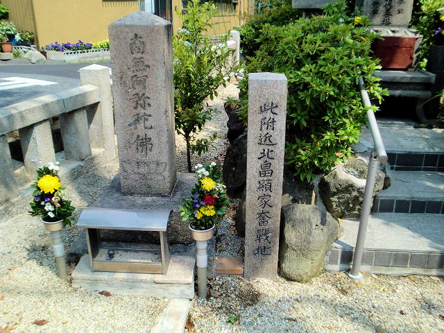 年6月10日)に和泉国堺浦の石津(現在の大阪府堺市一帯)において、南朝方と北朝方の合戦で北畠顕家(きたばたけ あきいえ)は南北朝時代の南朝方の公卿の武将で、父は北畠親房(北畠ちかふさ)です。足利尊氏(足利たかうじ)を九州に敗走させた功により鎮守府大将軍(ちんじゅふ大将軍)となり建武4年より延元2年に各地を転戦します。翌年「石津河原の戦い」で北朝方の高師直(こうのもろなお)の軍と戦い討死しました。享年21歳。顕家公とともに戦死された甲州波木井梅平の城主南部師行公(南部もろゆき公)と共に供養されています。北畠家は村上源氏の庶流である事からか、源顕家公と刻印されています。見どころは史跡供養塔。アクセスは阪堺電軌阪堺線「石津」駅下車 徒歩約7分、私鉄南海電車「石津川」駅下車 徒歩約10分