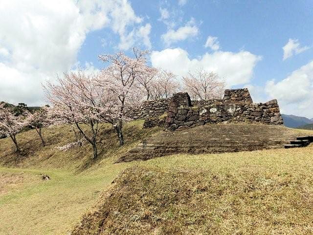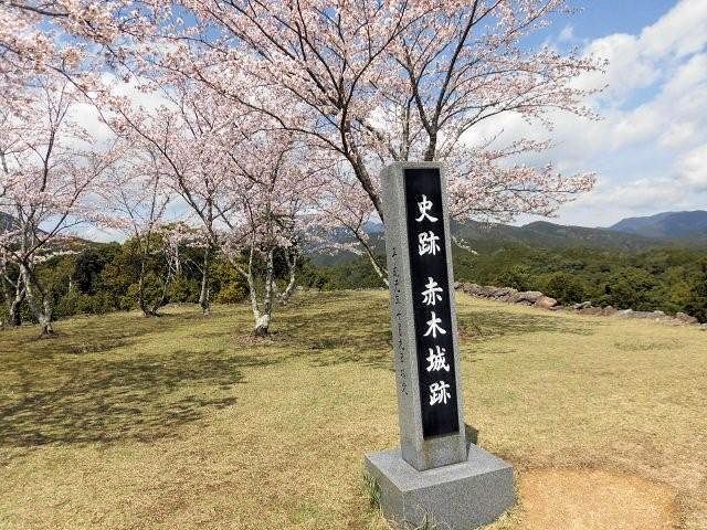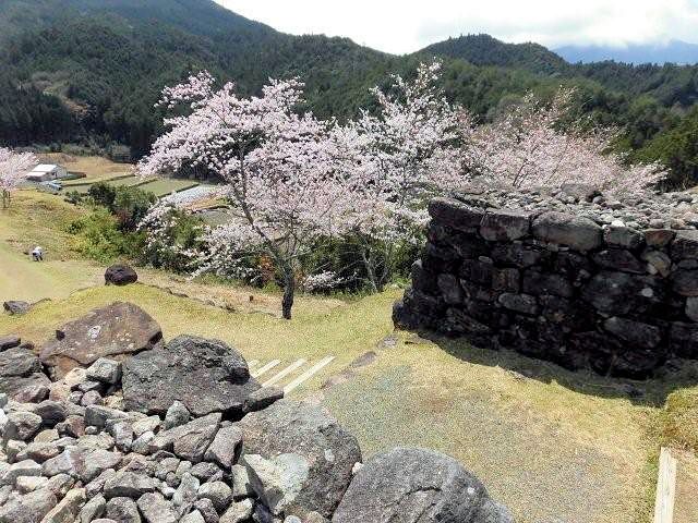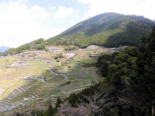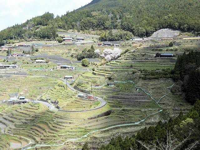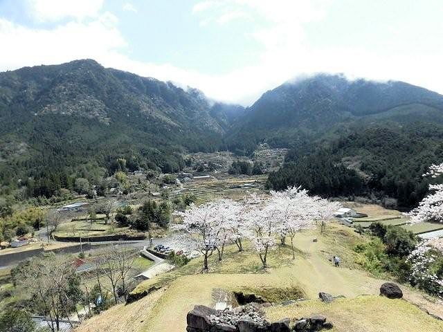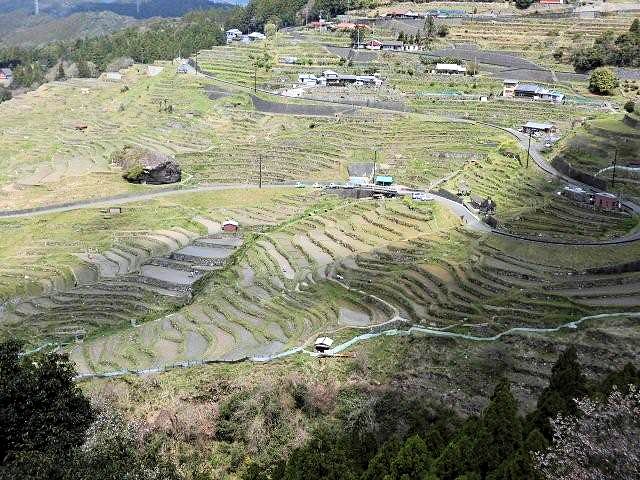 2016/04/05「花の窟神社」から車で走ること約1時間、紀和町赤木城跡に来ました。豊臣秀吉時代の築城名手の藤堂高虎が「天正の北山一揆」を制圧するために築いた城です。現在は標高230mの丘陵地に築城当時の遺構を示す石垣が残り、近年は天空の城として脚光を浴びています。日本の「天空の城」と称されているのは、竹田城跡を始めとする遺跡と比べると規模的には大きくはありません。それが幸いしてか登城の難易度が低く、観光客には嬉しいかもしれません。赤木城の沿革ですが、「紀伊続風土記」「倉谷家文章」などから 天正16年(1588)大和大納言(豊臣秀長)の北山攻め後、時の北山代官(藤堂佐渡守のちに和泉守高虎)が築きその地を統治しましたが、その際地侍を中心とした一揆が起こり加担した者をを赤木城の西方の田平子峠(たびらこ峠)で斬首し獄門にしました。藤堂高虎は文禄4年(1595)四国伊予三郡を与えられるまでの11年間、北山付近に在居し城郭の整備をしたものと考えられています。「天空」と云えばもう一つ違った風景が此の地に存在していました。それは、丸山千枚田です。江戸時代に築かれた日本最大規模の棚田ですが、かつては2240枚もの田があったと言いますが、今は残念ですが過疎化などで減少したようです。それでも現代では1340枚の水田が復活しており、四季折々の美しさを見せています。私も初めて見ましたが、「田圃」にこれ程感動するとは思いませんでした。また、季節や時間によっては、きっと変わった一面を見せてくれると思います。見どころは、赤木城跡(桜並木)、丸山千枚田。アクセスはJR「熊野市駅」より車でR42、R311、R40若しくはR760を経由し約40分で丸山千枚田。そこより更に10分で赤木城跡