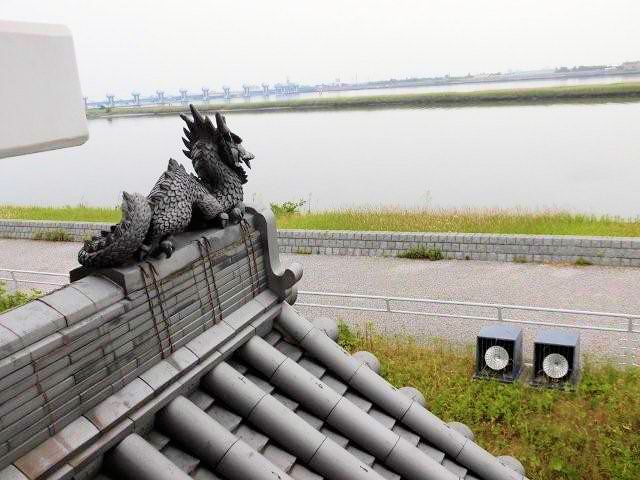 2017/05/24、神戸城の鈴鹿市をあとに、一路桑名市に向うことにしました。私事ですが、旧桑名郡長島町に実家があるのですが、殆ど訪れることなく30年以上経っています。本題に戻りまして、現在は郡部が統合されて桑名市になったことから名阪自動車道に続いて、伊勢湾岸道の長島ICが出来て非常に便利になり、桑名城跡には11時過ぎには到着しました。第一印象は大きな公園といった感じで、神戸城の様な石垣も見当たりません。敢えて言うなら、河川に佇む蟠龍櫓(ばんりゅう櫓)と本多忠勝の銅像が目立ちます。蟠龍櫓は歌川広重の「東海道五十三次・桑名」に海上交通「七里の渡し」の重要ポイントとして城が描かれています。豆知識として「蟠龍」とは、龍が天空に登り龍として飛び立つ前のうずくまっている状態の龍を指します。また、「その手はくわなの、焼き蛤」と言う言葉もあるくらい、蛤で有名な地でもあります。沿革は、永正10年(1513)に伊藤武左衛門が城館を築いたのが桑名城の起源と考えられています。関ヶ原の戦いの後、覇者となった徳川家康は慶長6年(1601)徳川四天王の本多忠勝を桑名10万石に封じました。忠勝は入封直後、揖斐川沿いに城郭の建造を開始しました。城には船着場も整備し、4重6階の天守をはじめ51基の櫓、46基の多聞櫓(兵士の宿舎)が立ち並び、また同時に城下町も整備されました。築城開始当初には四天王の一人である井伊直政も家臣を動員して普請の応援を行ったという逸話もあります。 元和3年(1617)2代忠政は播磨姫路藩に移封となり、代わって松平定勝が入城します。松平定重の時代、元禄14年(1701)には桑名市街地の過半を焼く大火に遭い、この際に天守も焼失してしまい以後再建はされませんでした。現在は九華公園として整備され、上記の蟠龍櫓も復元されて観光名所となっています。