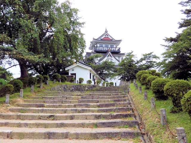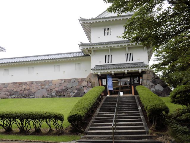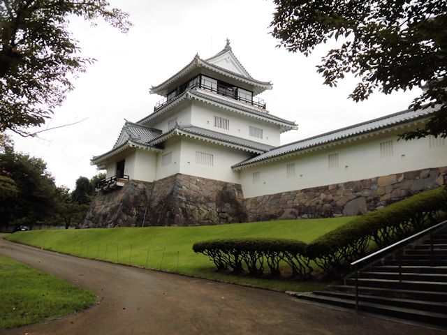 2017/09/14 長野県の善光寺を後に更に北上して次の訪問先、新潟県の長岡市にある長岡城に向います。 そこで、日本海を北上する北陸自動車道を避けて、上越自動車道の「須坂長野東IC」から「豊田飯山IC」間を利用した後、千曲川沿いに走る国道117号線で中抜きコースを取り、11時には長岡市に到着しました。 時間的にはまずまずです。 これで、高速代3,570円削減です。 長岡城は現在のJR長岡駅付近を本丸とする平城で、「兜城」や「浮島城」と呼ばれていました。 慶応4年の北越戊辰戦争で焼失し廃城となり、昔の面影を偲ばせるものはありません。 しかし長岡市は昭和43年に「蒼柴の森」(あおしの森)につつまれた悠久山公園の高台に模擬城として郷土史料館を建設しました。 平成4年には、郷土出身の先人顕彰の展示を開設し、人物を通して長岡の歴史文化を紹介しています。 長岡城の歴史は慶長10年(1605)堀直寄によって築城がはじめられましたが、完成したのは元和4年(1618)越後国長峰から入封した牧野忠成によるものです。 寛永11年(1634)忠成の二男康成に一万石を分封して与板藩(よいた藩)を立藩させ、以後代々牧野氏が続きました。 慶応4年(1868)に戊辰戦争が起こり、家老河井継之助(かわいつぎのすけ)はガトリング砲(銃口が複数ある回転式の機関銃)二門など大量の武器弾薬を購入して帰藩し、5月2日小千谷に陣を張った新政府軍の岩村精一郎と最後の談判が行われましたが交渉は決裂し開戦となりました。