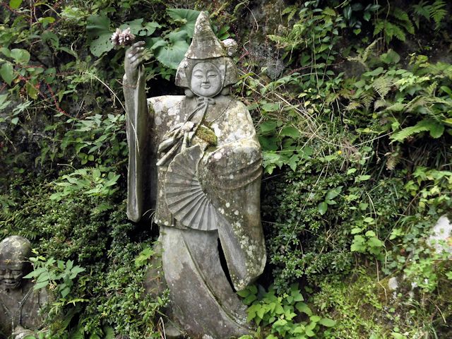 2017/09/16 NEXT訪問先はちょっと変わった石仏群が大量発生しているお寺です。 時刻は13時過ぎ、まだ日が高く明るい状態ですが境内は鬱蒼と茂った木々や、静寂に包まれた雰囲気の中、いきなり珍石仏のお出迎えで幕が開きました。 本堂までの石段には鐘楼や摩訶不思議な羅漢さんが右往左往していて、唯目を見張るばかりです。中腹には巨岩を背に本堂が佇み、その裏側にはびっしりと石仏群そして石壁に彫刻された仏画が参拝客を睥睨(へいげい)しているように見えます。 私たち善人者には笑顔に見えますが、そうで無い方にはご用心かもしれません。 ネットではカオスな羅漢と紹介されていますが、カオスとはギリシャ神話の原初神で、有限の世界が生まれる前の神で混沌とした状態(時代)から生み出された事を意味している為、色々な顔や風体の羅漢像を然うしてその様に紹介されたものだと思います。 この満福寺は、標高659mの東堂山の中腹に建つお寺です。 史跡名勝天然記念物に指定された杉並木の表参道を抜けると、巨大な自然石の上に建つ東堂山鐘楼にたどり着きます。 近世木造建築の粋を集めた小野町のシンボル的存在で、境内の奥には450体以上の個性あふれる羅漢像が奉安されております。
